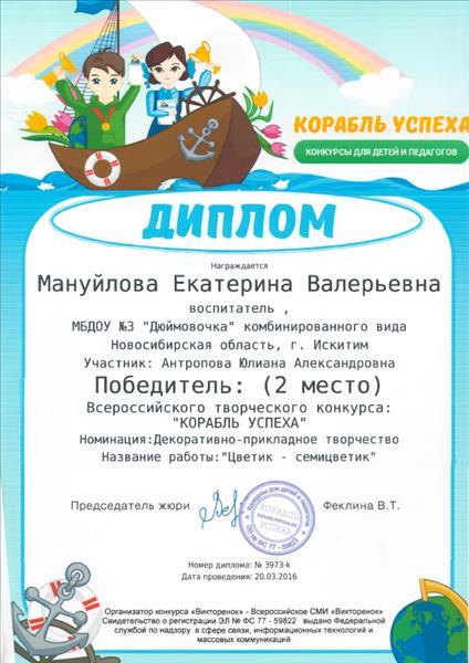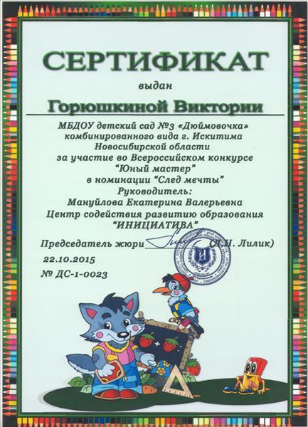 | Сертификат участника Всероссийского конкурса "Юный мастер", в котором руководитель - Мануйлова Екатерина Валерьевна. 2015г. |  |