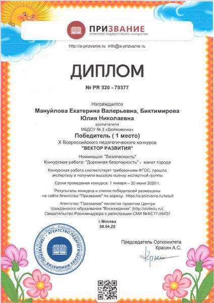 | Диплом победителя десятого Всероссийского педагогического конкурса "Вектор развития". Номинация: "Безопасность". 2020г. |  |
