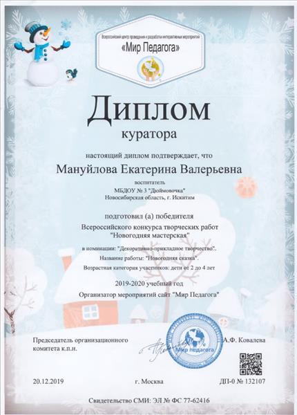 | Дилом подтверждает, что Мануйлова Екатерина Валерьевна подготовила победителя Всероссийского конкурса творческих работ "Новогодняя мастерская". 20.12.2019г. город Москва |  |